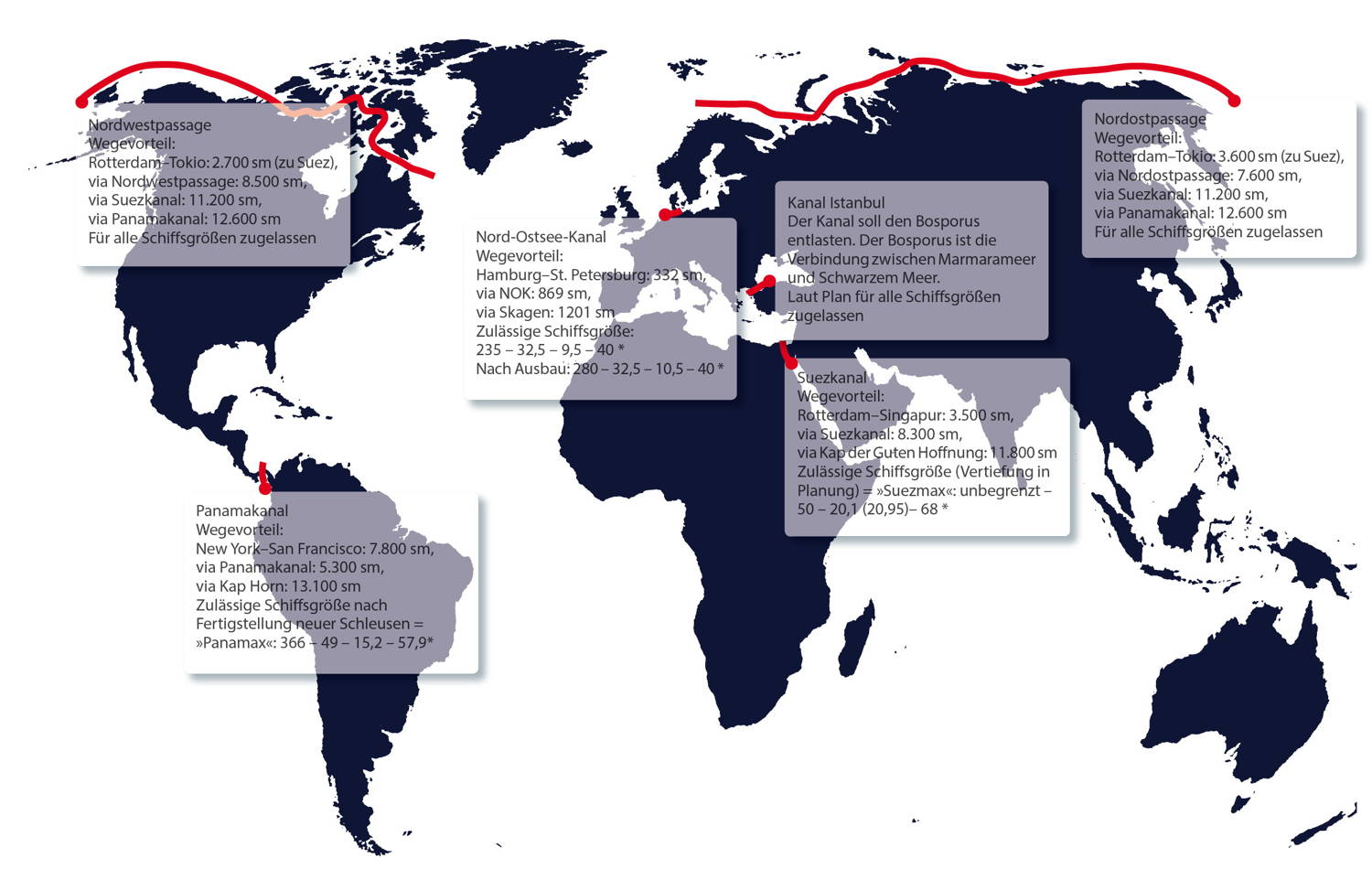 Die Klimaerwärmung gibt neue Seewege frei und die Schiffsgrößenentwicklung erfordert den Ausbau künstlicher Wasserstraßen. Ob und wie sich Routen verlagern, ist allerdings noch nicht absehbar. Überall wird gebaut. Am ein…