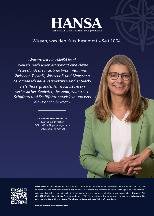 Wissen, was den Kurs bestimmt – seit 1864. Im täglichen maritimen Business machen fundiertes Fachwissen und schnelle Informationen den Unterschied. Wir helfen CEOs und Management-Ebene von Reedereien, Werften, Finanzierung, Politik und Verbänden dabei, ihr Geschäft erfolgreich auf die Zukunft auszurichten. Entdecken Sie hier, warum die HANSA für die maritime Welt unverzichtbar ist – und warum Werbung bei uns direkt die Entscheidungsträger erreicht.